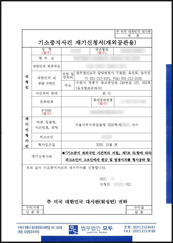 재기신청은 기소중지 재외국민 특별자수기간에 맞추어 미국 내 대한민국 공관을 통해 접수되었습니다.