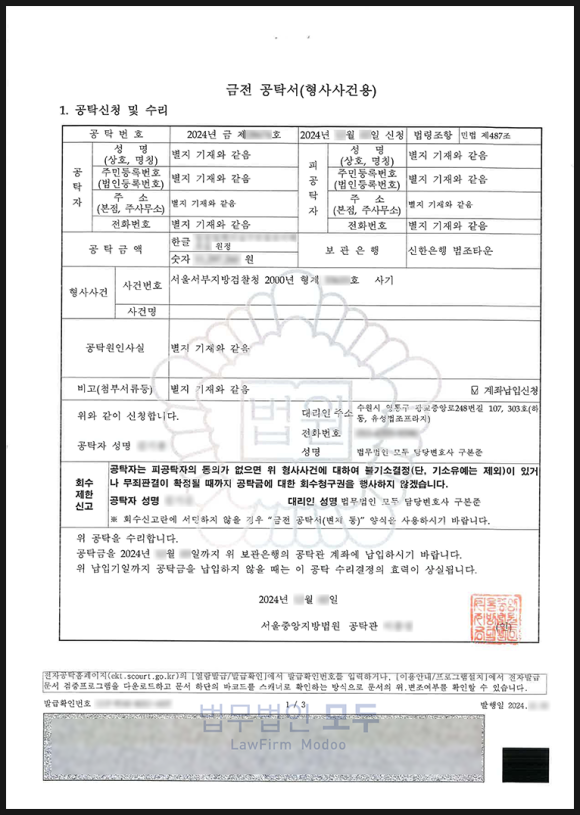 이에 따라 변호인은 고소금액에 해당하는 1,000만 원을 형사공탁하였고, 공탁서를 첨부하여 재기신청서를 작성하였습니다.
