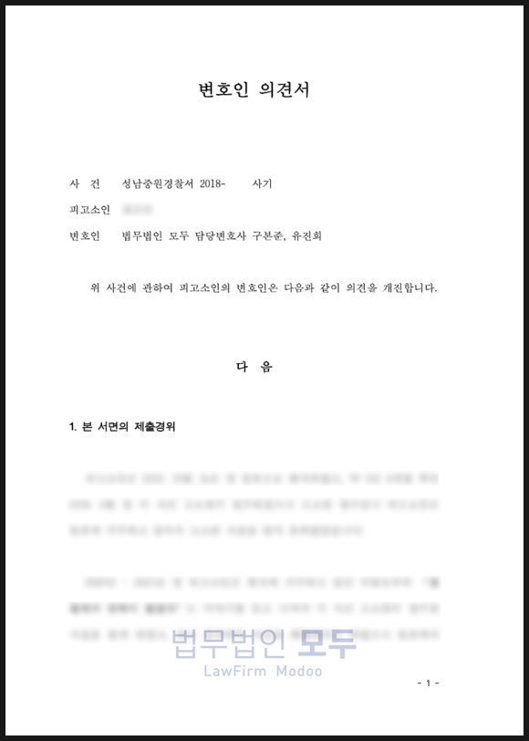 저희는 피의자 조사를 받기 전, 다음의 내용을 정리한 변호인 의견서를 작성하여 수사기관에 사전 제출하였습니다.