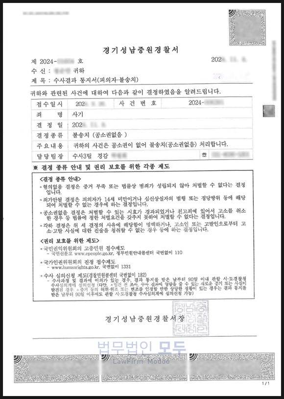 조사 후 얼마 지나지 않아, 수사기관은 본 사건에 대해 공소권없음(불송치) 처분을 내렸습니다.