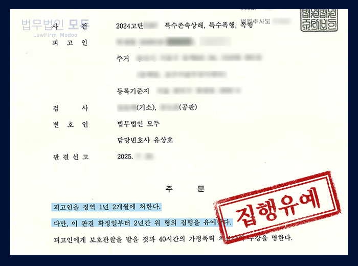 가족 간의 폭행으로 수감된 동종전과범 | 사건 요약개요가족을 위험한 물건으로 위협하고 폭행하여 특수존속상해, 특수폭행 등의 혐의로 체포, 구속당한 사건입니다.결과구속된 상태, 동종 전과범이라는 불리한 상황에서 구속적부심 인용 , 집행유예 처분을 이끌어냈습니다.────────────────────────────────────────────────────────────────────────| 상세 진행 과정1. 사건의 개요이번 사건의 피고인은 피해자 김길녀씨의 아들이자, 피해자 박예지씨의 오빠였습니다.2025년 1월 10일, 가족 간 말다툼이 격해지면서 피고인은 순간적인 분노를 이기지 못해 피해자 박예지씨가 앉아있는 의자를 여러 차례 발로 차고, 이를 말리는 어머니 김길녀씨를 밀쳐 넘어뜨렸습니다.이 과정에서 피고인은 위험한 물건인 다리미를 집어던졌고, 넘어져 있던 어머니를 향해 나무 막대기를 들고 위협하며 복부와 가슴을 수차례 걷어차는 행위를 했습니다.또한 동생의 얼굴을 주먹으로 가격하여 안와골절상을 입히는 등 폭행의 정도가 상당했습니다.이웃의 신고를 받고 경찰이 출동하였고, 수원영통경찰서는 피고인을 특수존속상해, 특수폭행 등의 혐의로 체포하고 구속영장을 신청하였으며, 법원에서도 구속영장이 발부되었습니다.2. 특수폭행죄 구속적부심 청구피고인의 구속 이후, 피고인의 아내는 법무법인 모두를 변호인으로 선임하였습니다.형사전문 변호인은 사건을 검토한 뒤, 단순히 혐의를 다투기보다 '구속적부심' 절차를 통해 피고인을 조속히 석방시키는 것이 사건 초기 대응의 핵심이라 판단했습니다.구속적부심이란,수사기관의 구속이 부당하다고 판단될 경우 법원에 그 적법성과 필요성을 다시 심사해 달라고 청구하는 절차로 실무상 인용률이 매우 낮은 절차입니다.변호인은 다음과 같은 사유를 중심으로 구속적부심사청구서를 제출했습니다.⦁ 피고인은 혐의를 인정하고 있으며 증거 인멸의 우려가 없음⦁ 피해자들과의 관계는 가족이며, 향후 추가 가해 가능성 낮음⦁ 사건은 일시적인 감정 폭발로 인한 것으로, 재범의 위험성이 크지 않음결국 재판부는 변호인의 주장을 받아들여 구속적부심을 인용했고,피고인은 구속된 지 이틀 만에 약 10만 원 상당의 보증보험으로 보증금을 대체하여 석방될 수 있었습니다.3. 특수폭행죄 양형자료석방 후에도 수사는 계속되었고, 결국 피고인은 특수존속상해 및 특수폭행죄로 기소되었습니다.변호인은 피고인의 반성 및 가족 간의 화해를 입증하기 위해 다음과 같은 자료를 충실히 제출했습니다.⦁ 피해자들과의 합의서 및 처벌불원서⦁ 가족관계증명 및 피고인의 사회적 유대⦁ 피고인의 직업 안정성에 대한 자료⦁ 진심 어린 반성문⦁ 가족의 탄원서피고인에게 과거 폭행 전과 15범이 있었던 불리한 사정이 있었으나,피해자들이 모두 선처를 호소한 점, 상해의 정도가 중하지 않았던 점 등이 양형에 긍정적으로 반영되었습니다.변호인은 그동안의 생활 개선 노력과 가족 간의 진정한 화해를 강조하여 재판부를 설득했습니다.4. 구속, 동종 전과에도 집행유예변호인의 적극적인 방어 결과, 법원은 피고인에게 징역 1년 2개월, 집행유예 2년을 선고하였습니다.이 사건은 구속적부심 인용이라는 드문 결과와 함께, 중한 폭행 전과가 있었음에도 집행유예를 이끌어낸 사례입니다.사건을 맡은 변호인은 다음과 같은 점을 중시했습니다.⦁ 단순히 혐의 부인을 위한 방어가 아니라, 구속 자체의 필요성을 근본적으로 다투었음⦁ 적부심 인용, 구속 해제 이후에도 재판부를 설득할 수 있도록 전략적 양형자료 구성⦁ 피해자와의 신속한 합의와 진정성 있는 사후조치만약 피고인이 구속된 상태로 재판을 받았다면, 집행유예 선고가 내려질 때까지 4~5개월간 구치소에서 수감생활을 해야 했을 것입니다.그러나 법무법인 모두의 조력으로 불구속 상태에서 재판을 받으며 일상으로 복귀할 수 있었습니다.5. 구속적부심 변호사의 도움이 필요할까형사사건에서 '구속'은 단순한 절차가 아니라 인생의 분기점이 됩니다.경험 많은 형사전문 변호사는 사건 초기부터 구속적부심, 보석, 합의, 양형자료 등 모든 수단을 활용하여 의뢰인의 고통을 최소화하고, 재판부의 합리적 판단을 이끌어냅니다.법무법인 모두는 구속사건, 폭행 · 상해, 특수범죄 등 형사사건 전반에서 구속 해제와 집행유예 선고를 이끌어낸 다수의 실무 경험을 보유하고 있습니다.형사사건으로 인해 가족이 구속된 경우 혼자 고민하지 마시고 즉시 전문가의 조력을 받으시기 바랍니다.