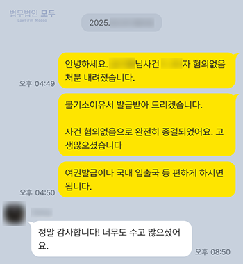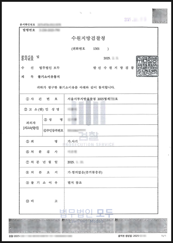이후 추가적인 검토를 거쳐 약 1개월 뒤, 검찰은 피의자에 대하여 혐의없음(증거불충분)처분을 내리며 사건을 종결하였습니다.