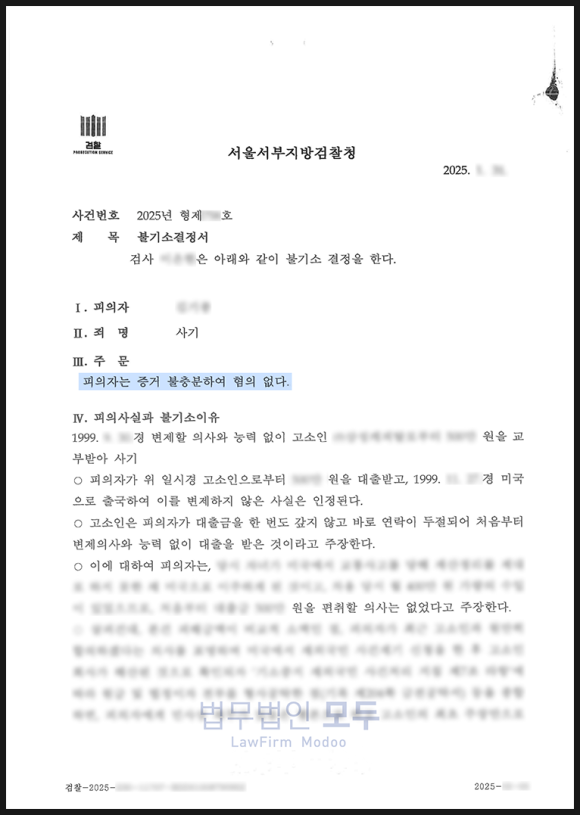 또한 단순한 채무불이행과 사기죄의 구별이라는 법리적 쟁점을 명확히 정리함으로써 재기 뿐만 아니라 혐의없음 처분을 이끌어낼 수 있었습니다.