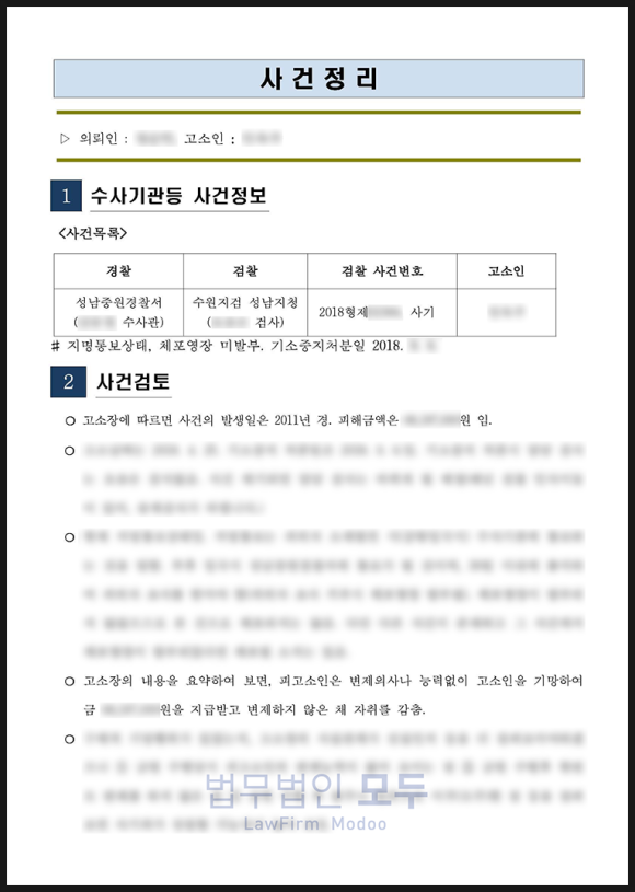 형사사건, 특히 사기 사건은 일반적으로 피의자의 행위가 사기죄의 구성요건을 충족하는지 여부를 중심으로 검토합니다.