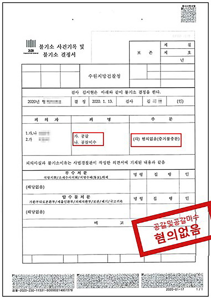 공갈죄, 증거불충분, 불기소처분, 무혐의, 증거불충분