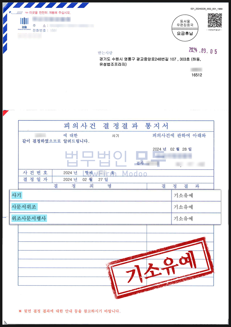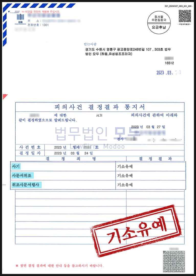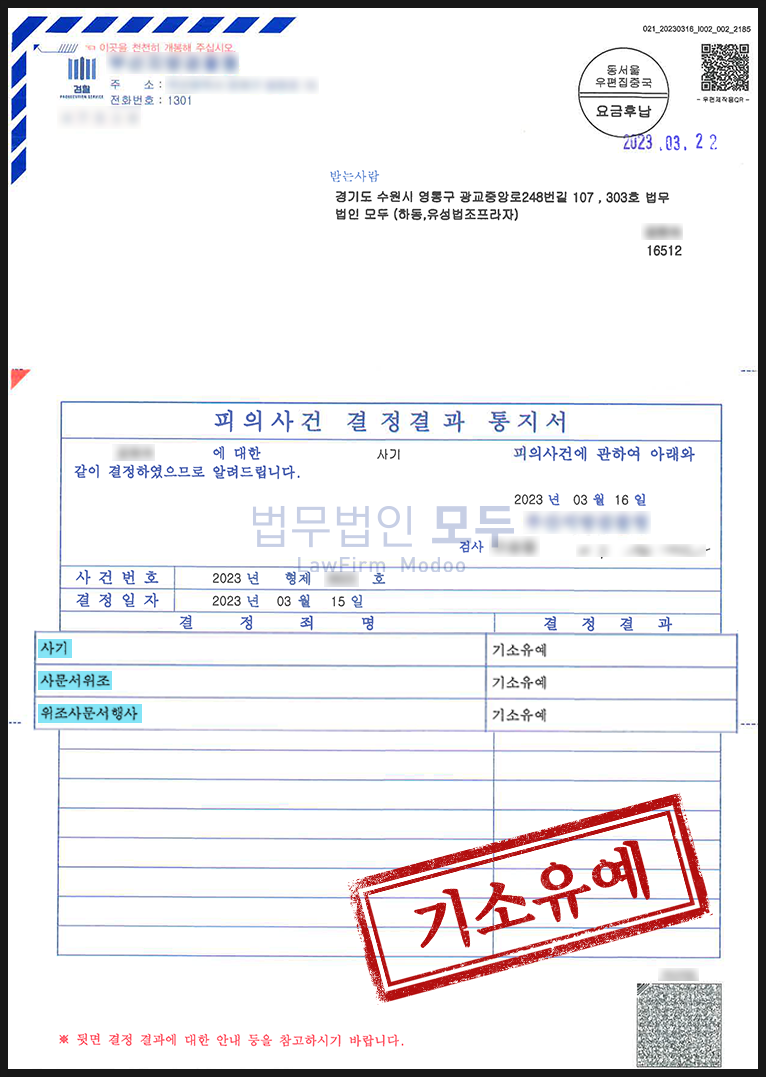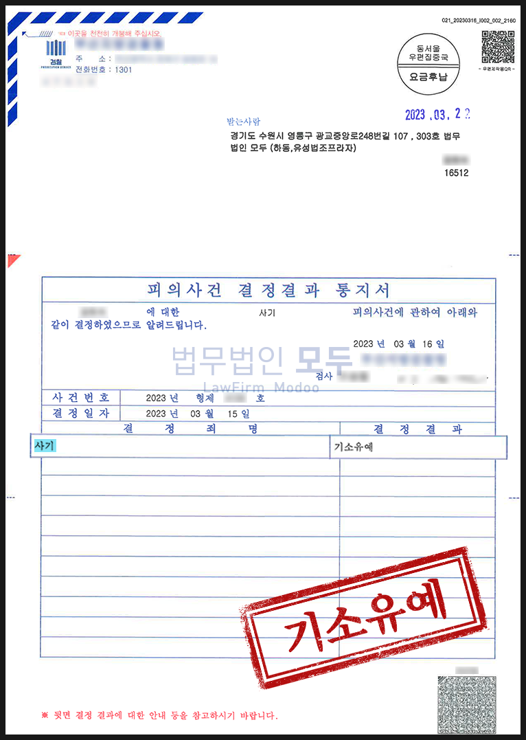 기소유예 처분은 전과가 남지 않고 피의자에게 어떠한 불이익도 없기 때문에 좋은 결과였습니다.