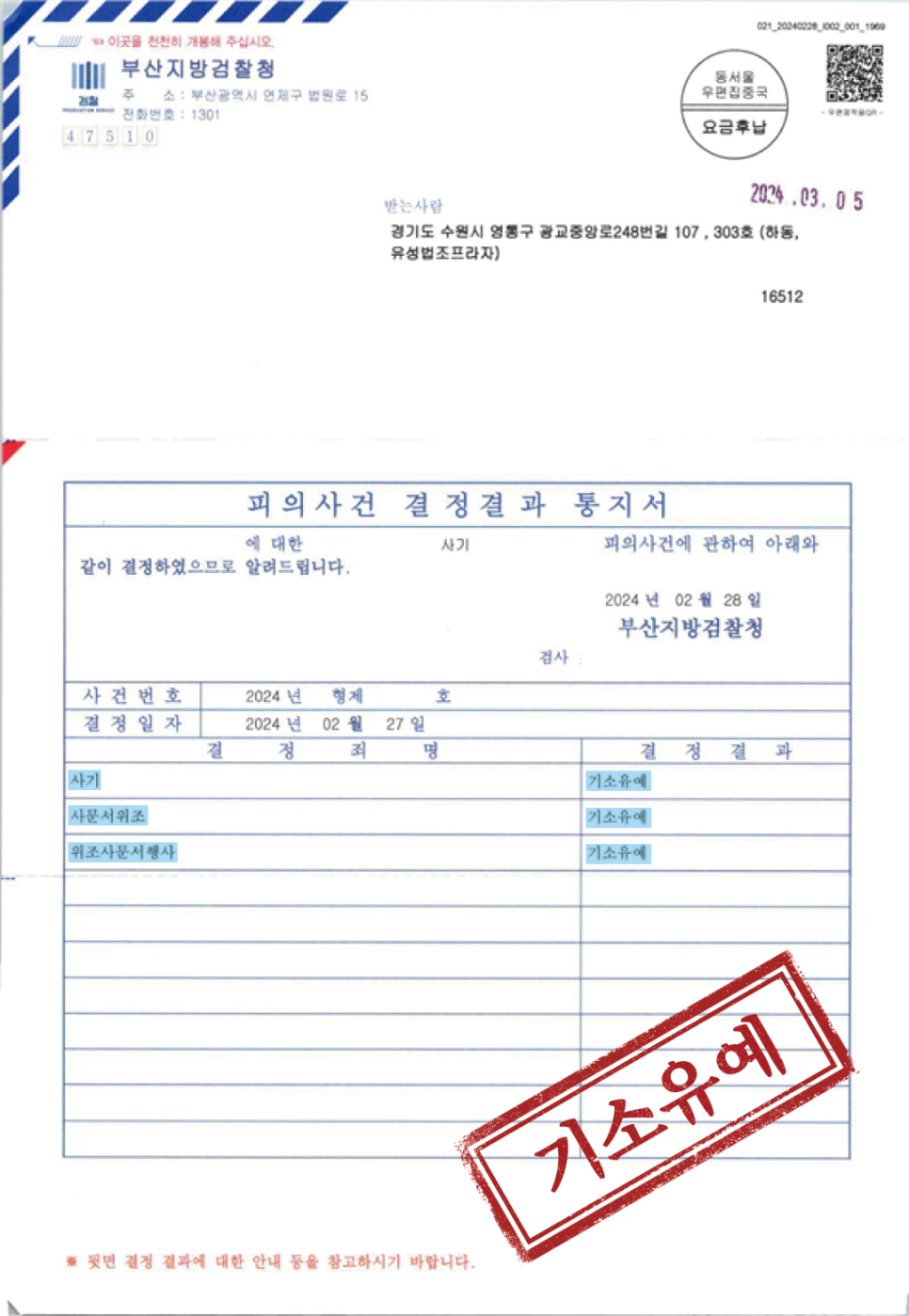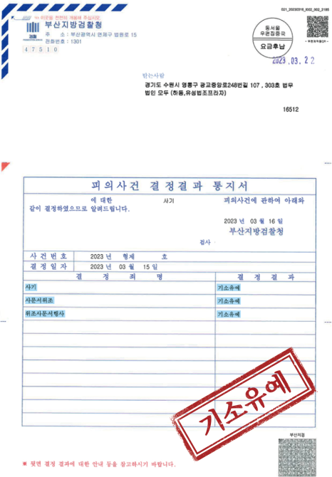 결국 가족들은 K 씨를 부산지방검찰청에 사기 및 사문서 위조, 동행사죄 혐의로 고소하였다.