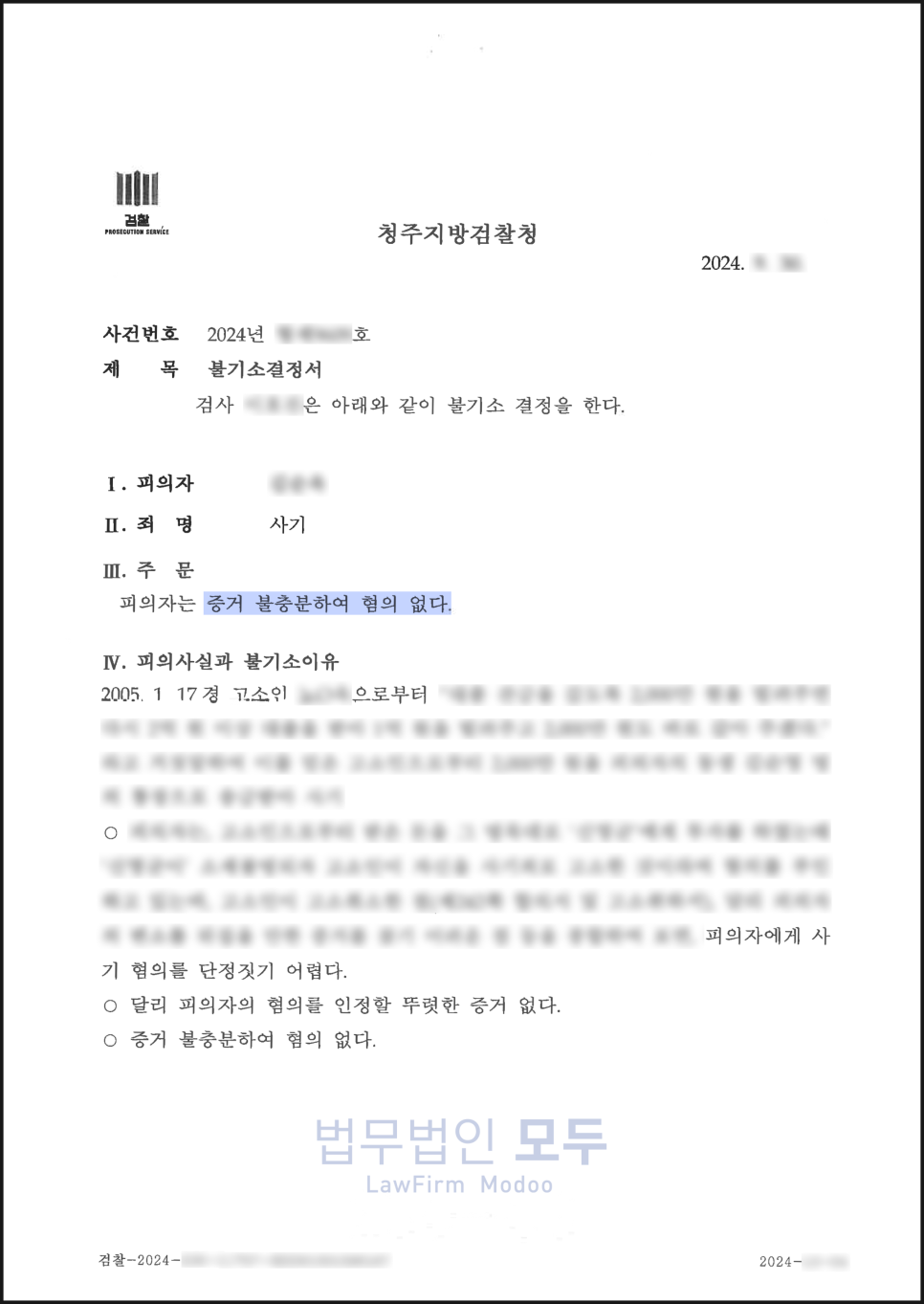 다만 처분에는 수개월이 걸렸는데 의뢰인이 직접 제출한 재기 신청서와 고소인의 진술이 일부 상반되었기 때문이었습니다.