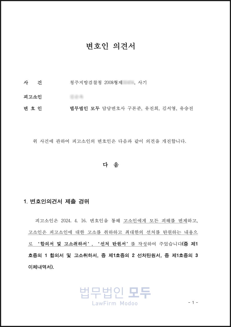 의뢰인이 재기신청서를 제출한 상황이었기 때문에 합의서를 첨부하여 변호인 의견서를 추가 제출 했습니다.