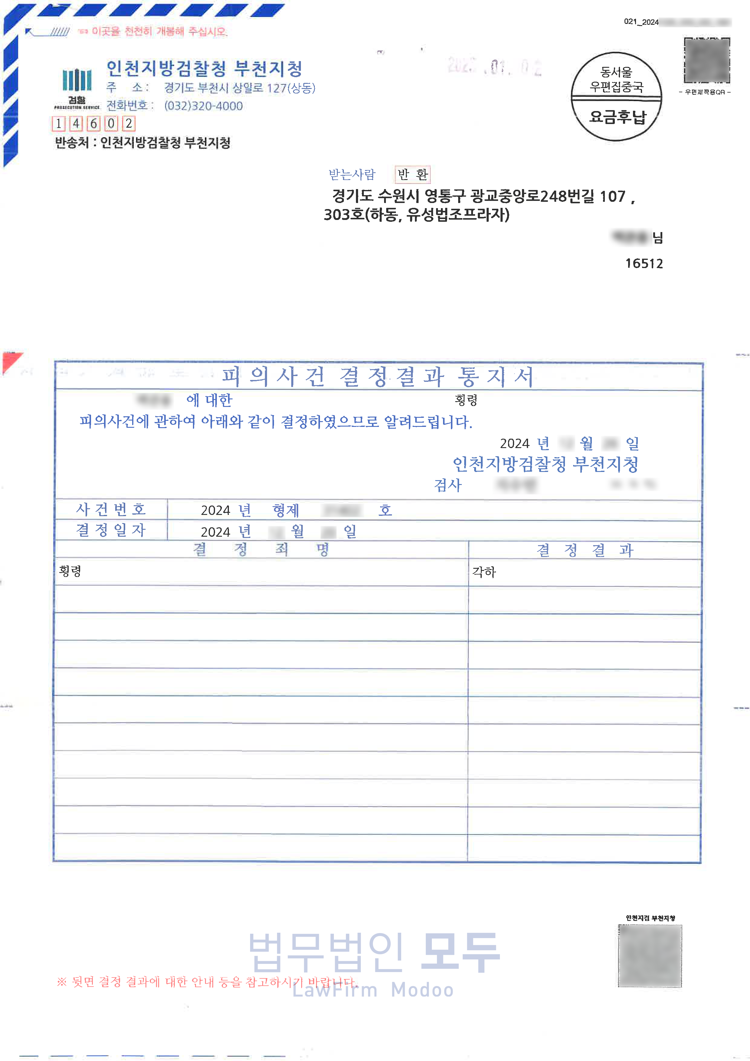 이 사건은 특이하게도 재기 후 형사조정 절차로 진행되어 처분이 내려진 사건이었습니다.