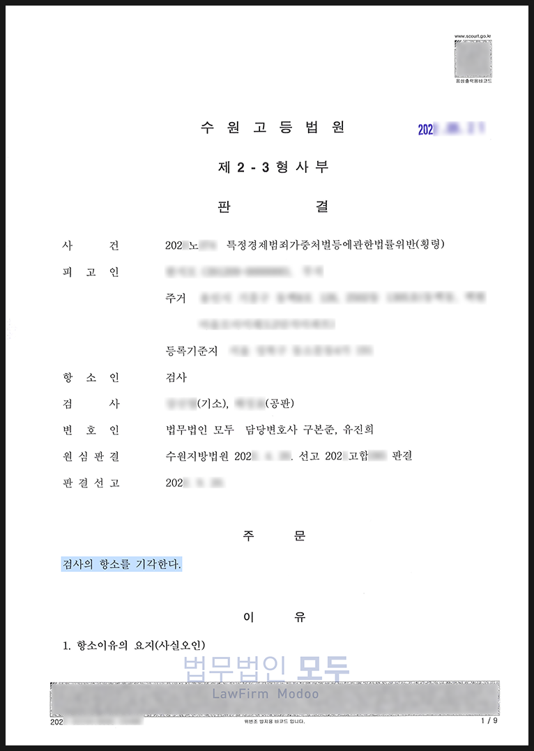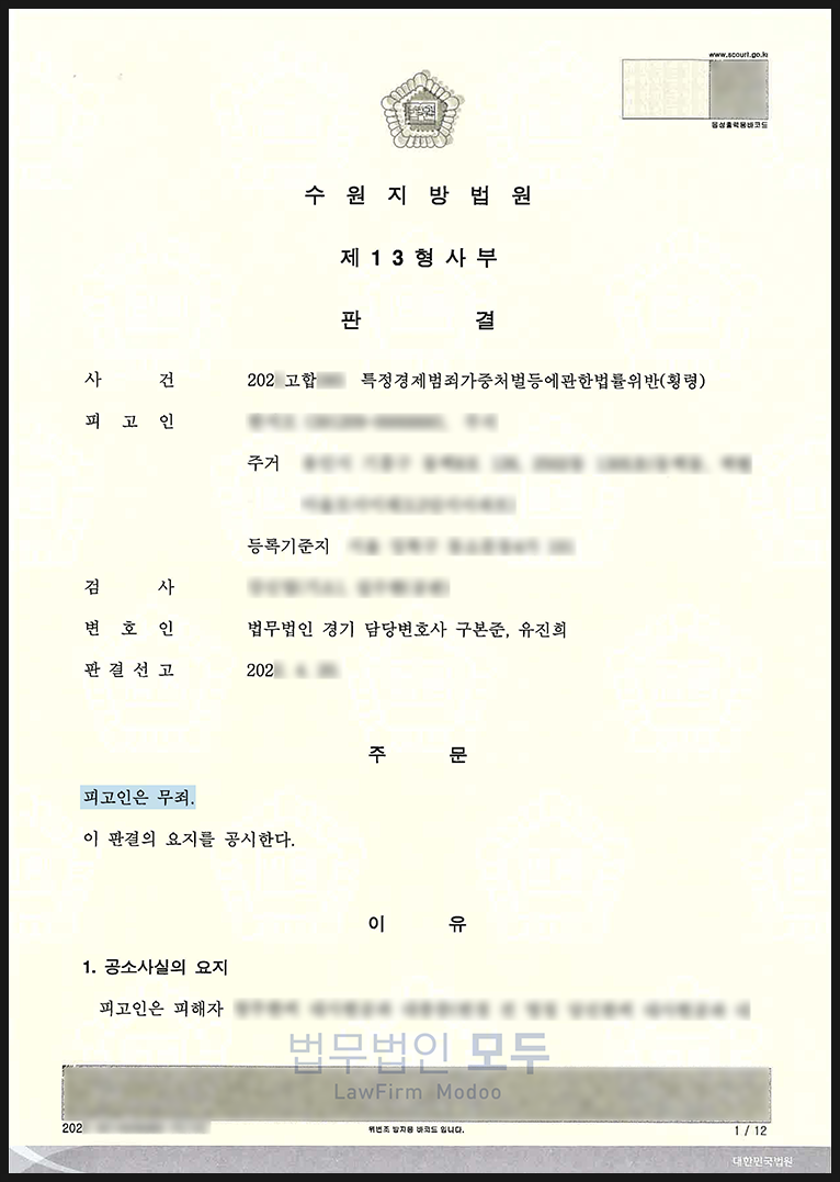 오늘은 특정경제범죄 가중처벌 등에 관한 법률 위반(횡령) 혐의로 기소되었으나 1심과 항소심 모두 무죄를 선고받은 사례를 소개해 드리려 합니다.
