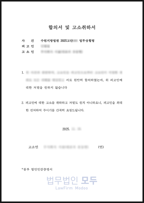 결국 주장을 굽히지 않던 고소인도 저희의 제안에 동의하였고 합의서가 작성되었습니다.
